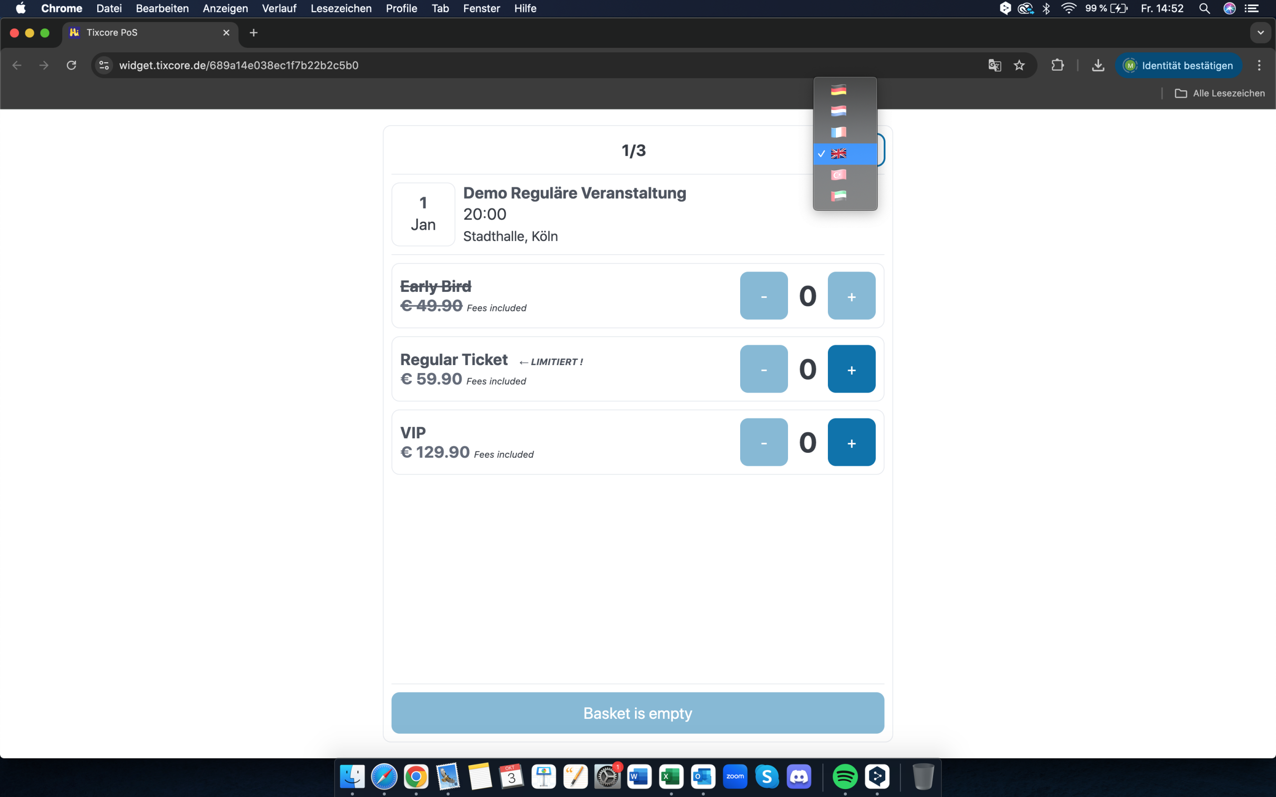 Tixcore unterstützt mehrere Sprachen und verschiedene Währungen. Damit verkaufen Sie Ihre Tickets problemlos auch an internationales Publikum.